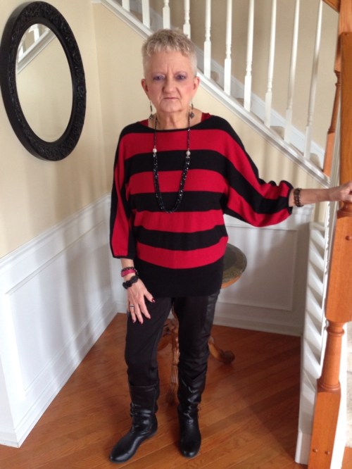 Welcome back to Carol’s Corner. Sorry I didn’t get to post yesterday. I just felt totally exhausted all of a sudden, didn’t get my workout in or make my step count. Guess we all need a rest day once in awhile. This was my outfit yesterday. Wore Red for National Go Red Day. Got the sweater on my shopping trip at my daughter’s. Love the whole outfit. Forgot my special pin when we took my picture yesterday, so here it is.