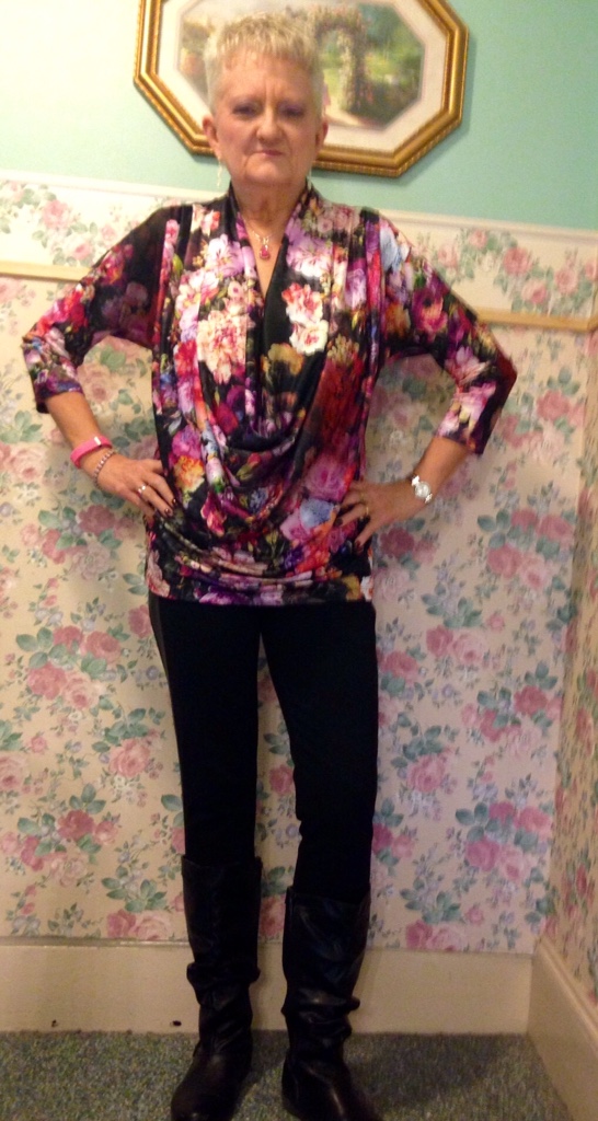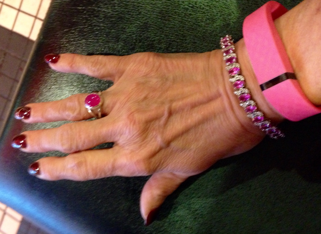 Welcome back to that place in blogging land that I call Carol’s Corner. Hope everyone is having a good and productive weekend. After a much needed rest, I bounced back this morning and published the blog I couldn’t do last night. Then I fit in a four mile workout to start my day. Gonna post a pic of my workout attire , so you can see me minus my makeup and all that stuff. My picture above is an outfit I’m really loving. Those of you that have been around long enough, know how I love color. I bought this top on my Pa. shopping trip while at my daughter’s. That blouse just has CAROL written all over it, from the style, to the gorgeous print , and finally the beautiful array of some of my favorite colors. The necklace and ring are handcrafted by local artisans. And yes, I have a matching FitBit band.
