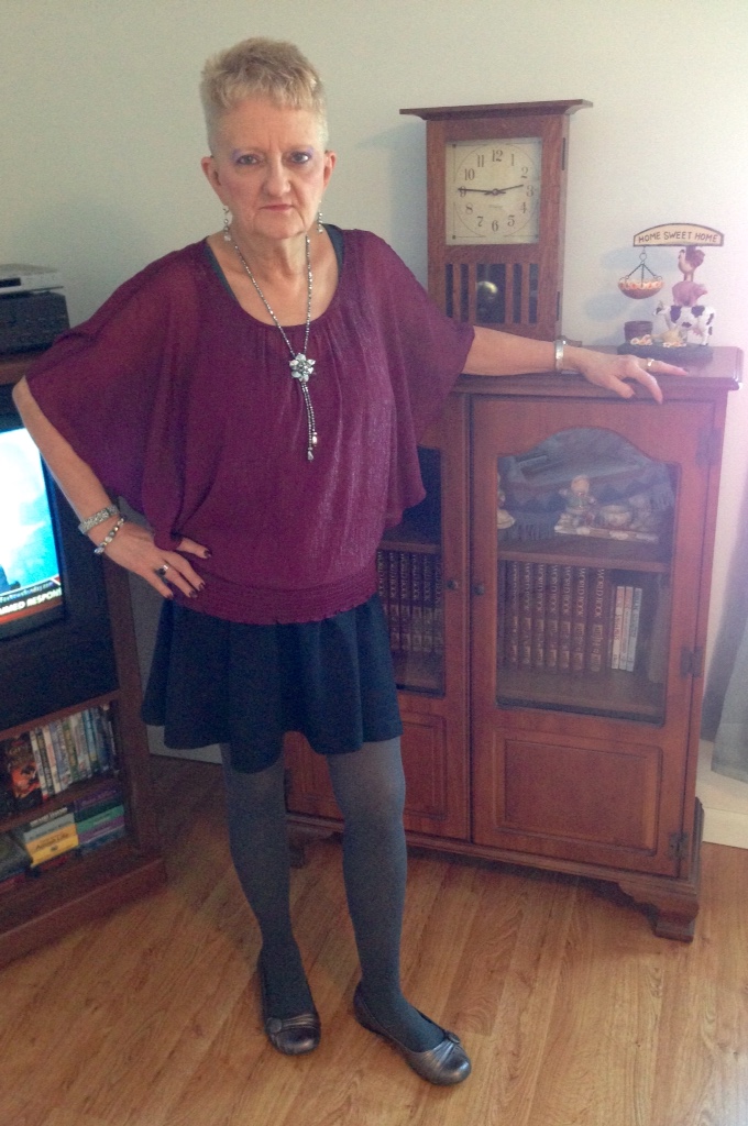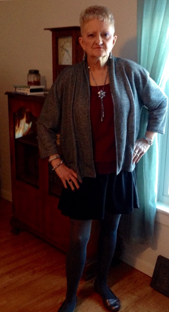 The above picture is the same outfit with an added topper. Can’t have too many of those. It is from Avon and blended nicely with the whole outfit. This entire outfit makes me feel younger than my 64 years.