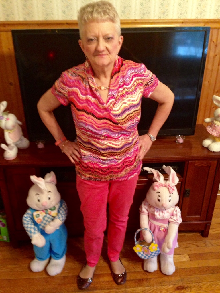 Welcome back to Carol’s Corner. Hope the start of your week is fantastic. I wish I could say the weather is getting better, but no such luck. I don’t think we’re gonna have much of a spring this year. I am just tired of being cold. So let’s get my pictures taken care of and then we will get busy finishing( I hope) our long exercise segment. Was excited to see these pants match so many things in my closet. They match this blouse perfectly. My “Name This Outfit”, continues without a break in the action. I call today’s ” Psychedelic Kaleidoscope”. I had to ponder for awhile what I was going to call this one.