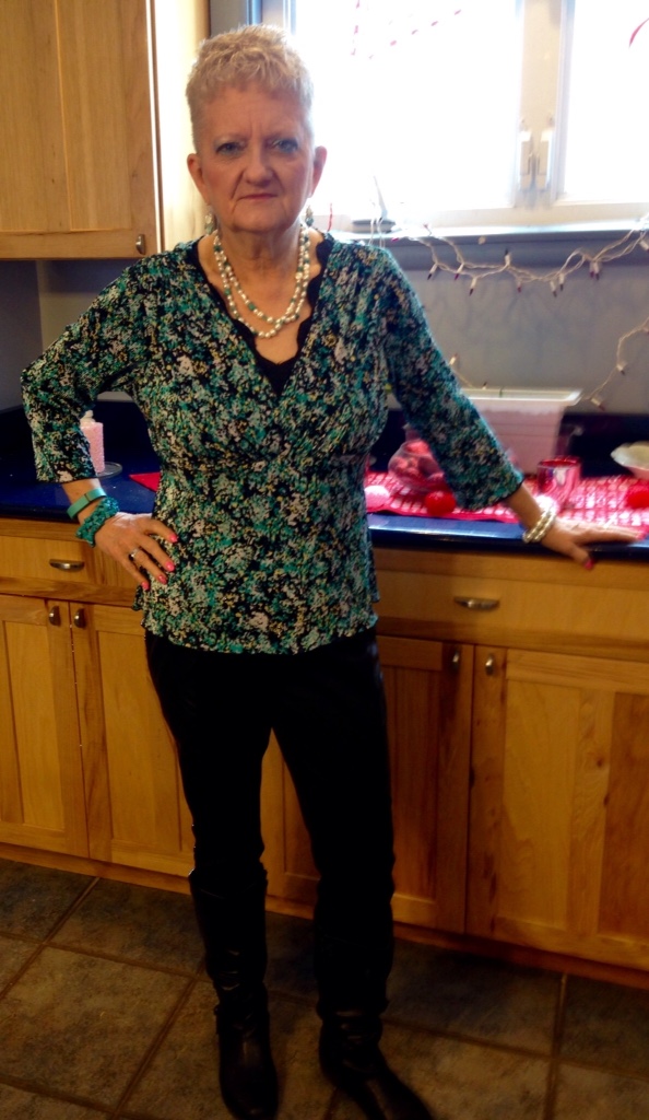 Welcome to another night in Carol's Corner. It's gonna be another below zero night and winter shows no sign of abating. My daughter in Pa got hit with a 10 inch snowfall today and we got none. Yeah!! The ice storm the day before was worse there too. The blouse in this picture is one of my thrift store finds. I totally love the scallop lace insert. Decided to dress it up with some lighter color accessories.