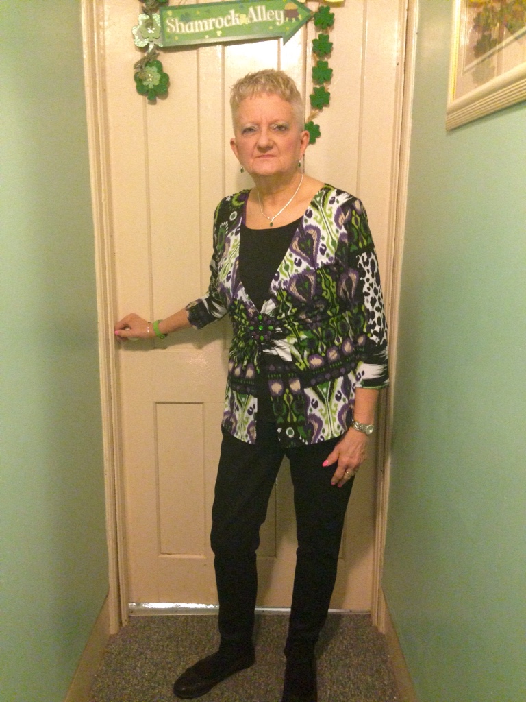 Welcome to The St. Patrick's Day Edition of Carol's Corner. Somehow I managed to cobble together some kind of outfit in honor of the day. I don't actually own too much green, but remembered this thrift store top I had purchased, and since it's paired with my favorite color, purple, it fit the bill quite nicely. I then found some jewelry from Avon I had from a long time ago, in fact I'm not sure I ever wore it. That along with my FitBit combo, and my holiday outfit was good to go.