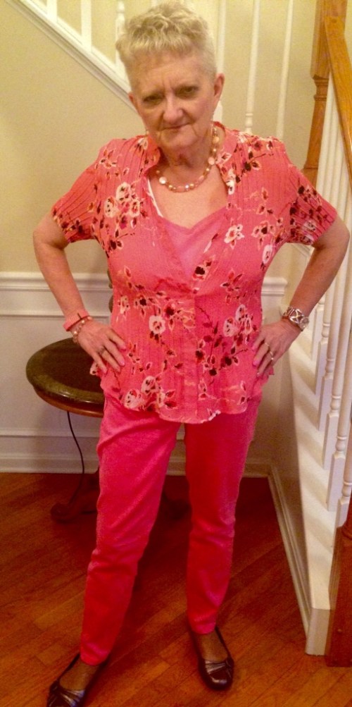 Welcome to a new Edition of Carol’s Corner. Hope you enjoyed the last issue. Today’s picture I’m calling peaches and cream. I’ve been having fun nicknaming some of my outfit’s.This top is another thrift store purchase from last year. It matches these pants perfectly. If it was summer I have cloth shoes and sandals that would match this beautifully. Well one can hope. Winter has to end sometime soon.
