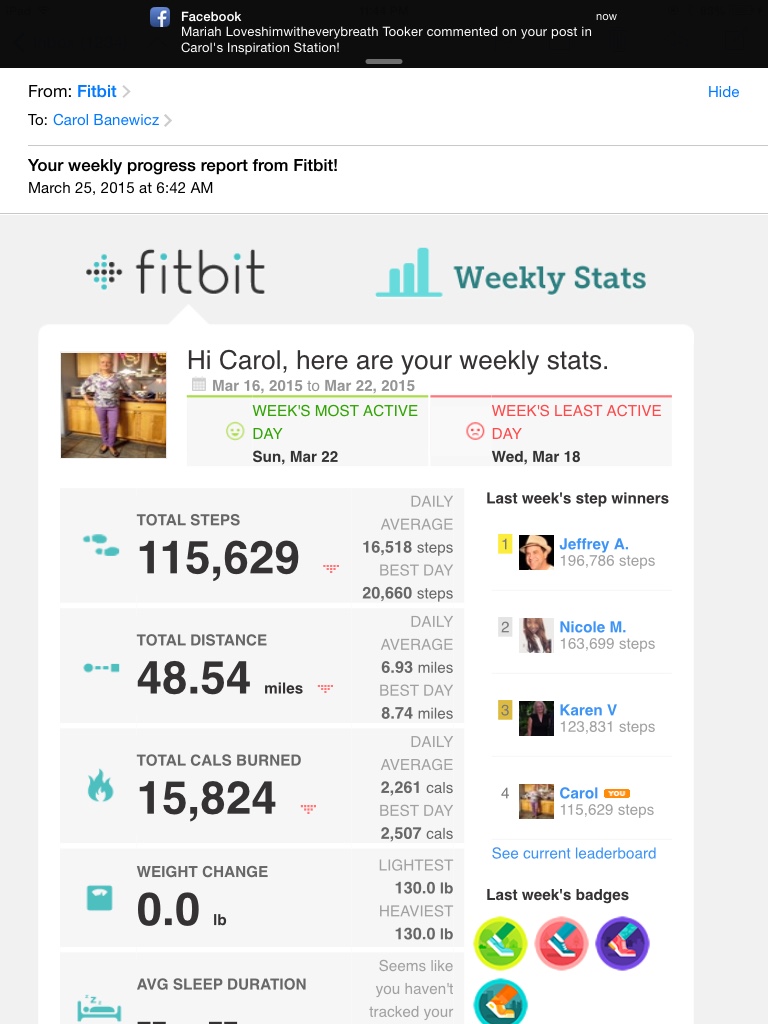Since we are talking about exercise I thought you might enjoy seeing my weekly stat report. Think this has to have been my best week , because I have really been stepping up my workouts. My March workout total stands at155 miles, which I think is my personal best and March isn’t over yet.