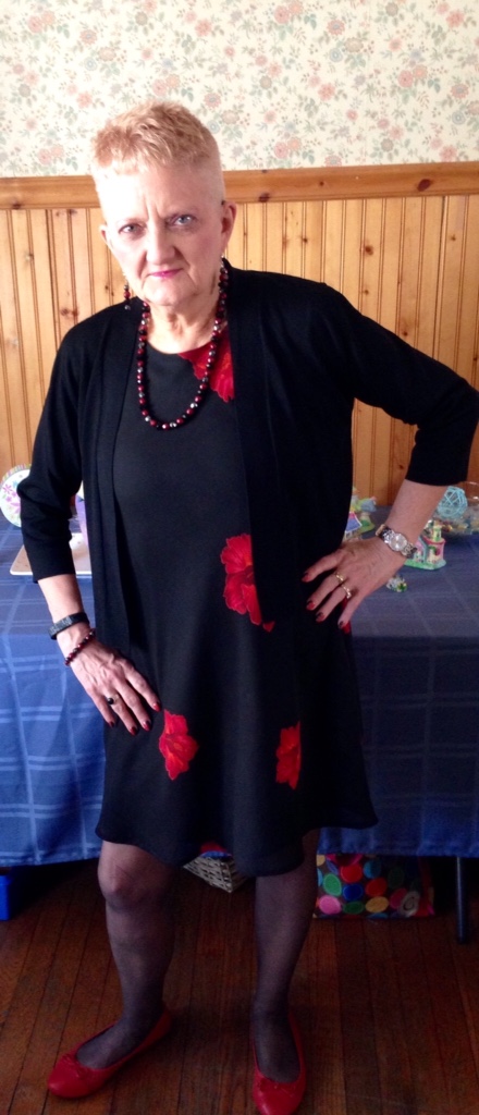 Welcome to this Easter weekend edition of Carol's Corner. I'm not doing a regular blog post tonight . I want to just touch base. I hope to be able to put something together tomorrow night. Today's picture I've entitled” Red Steals The Show”. The dress is another of my thrift store finds from last year. I love the big red flowers on the solid black background. The short black sweater goes perfectly with it, along with a jewelry set I had made, and I absolutely love the red shoes with it.