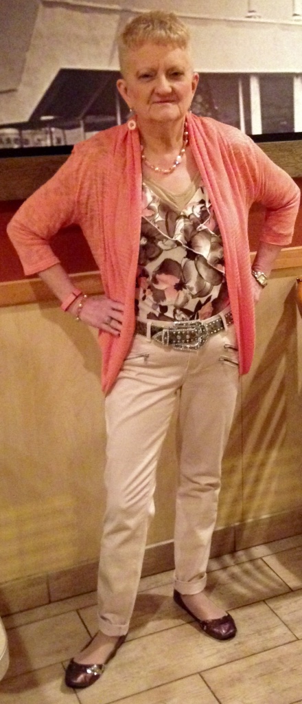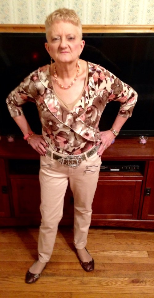 It's that time again. Pull up a chair, grab your favorite drink, and spend some time here at Carol's Corner. I hope everyone has had a great and productive week. Going to start with the picture portion as usual. I totally love everything about my outfit today. Everything just blends so beautifully. It didn't take me long to title today's ensemble. Peaches and Cream anyone? This pretty blouse is another thrift store find from this past year. I made this jewelry and it really brings out the peach tones.