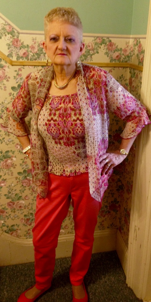 Welcome back to my little corner of the blogosphere. Finally had a glorious day in Central New York, at least one day anyway. So think Spring. Think beautiful colors and new blossoms when you're flowers start getting their buds. I decided to start thinking spring colors with my clothing as I'm sure you've noticed as of late, and today is no exception. This two piece top is something I got on one of my thrift store shopping trips and it's just blooming with color. So with that in mind I decided to call this outfit “Color Reigns Supreme”. I also decided to marry the colors in the blouse by wearing contrasting pants and shoes.