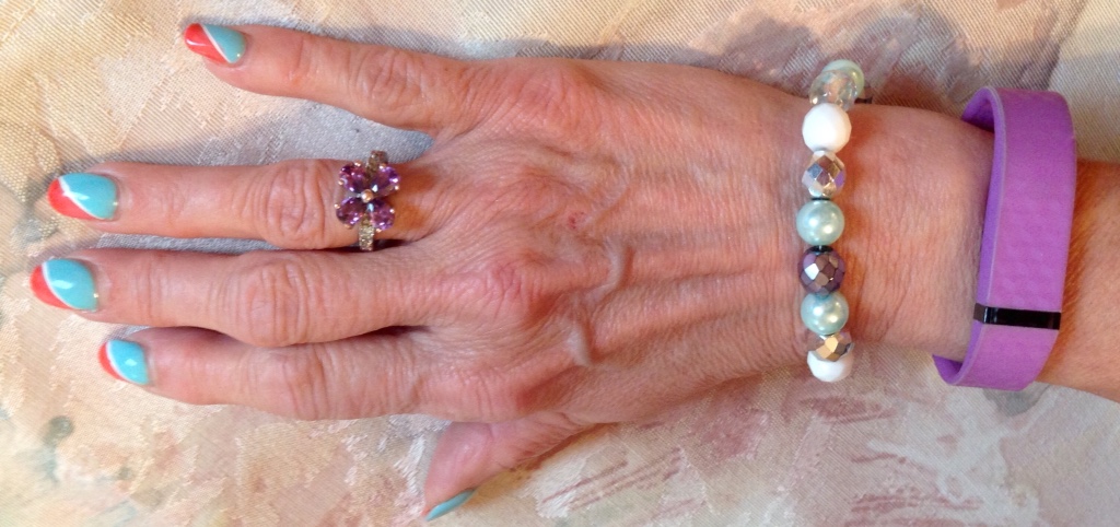 My FitBit combo combines the purple tones with the greens in the blouse. It all just goes beautifully together.