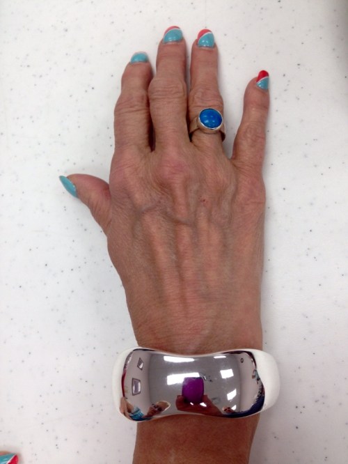 Loving wearing this beautiful bracelet that houses my exercise tracker. Note that you can see my face in the bracelet and hubby holding the phone taking the picture. Kinda cool. It took me a minute to figure out that the pink was hubby taking the picture with my phone. This ring is another one that was designed and made by the jewelry artisan I told you about. All the rings are made of sterling silver and have real stones. This one is turquoise. The coolest part of these rings are what you can’t see. They each have a hammered band which looks really cool.