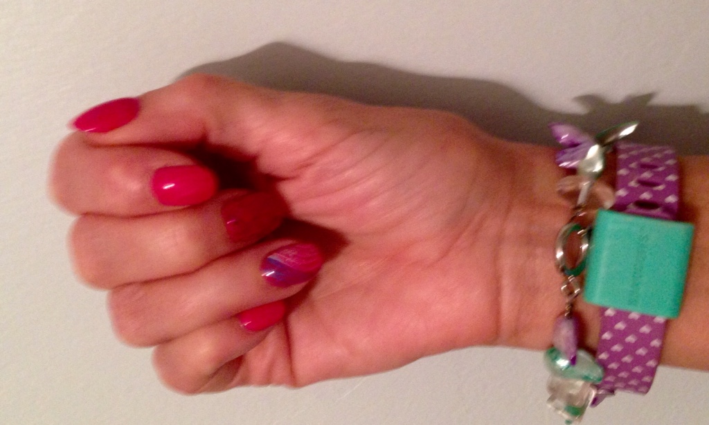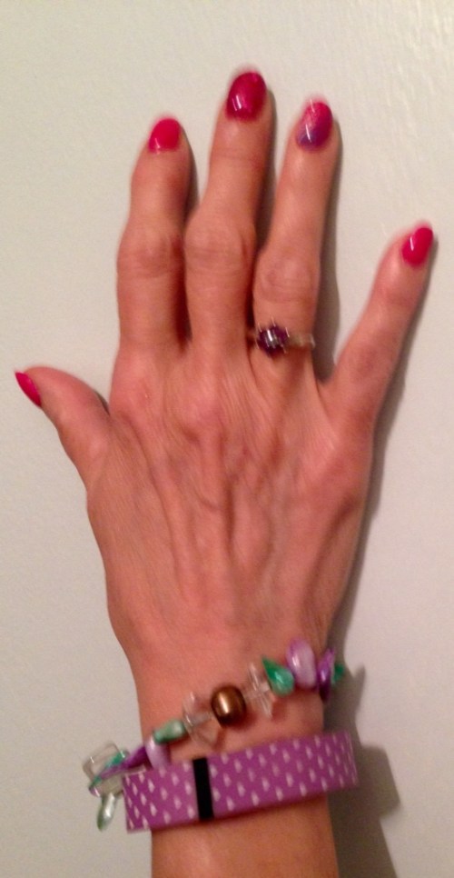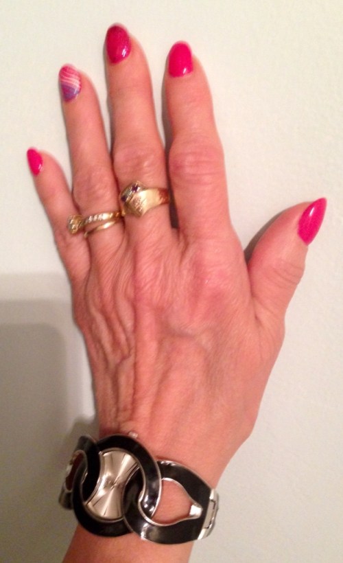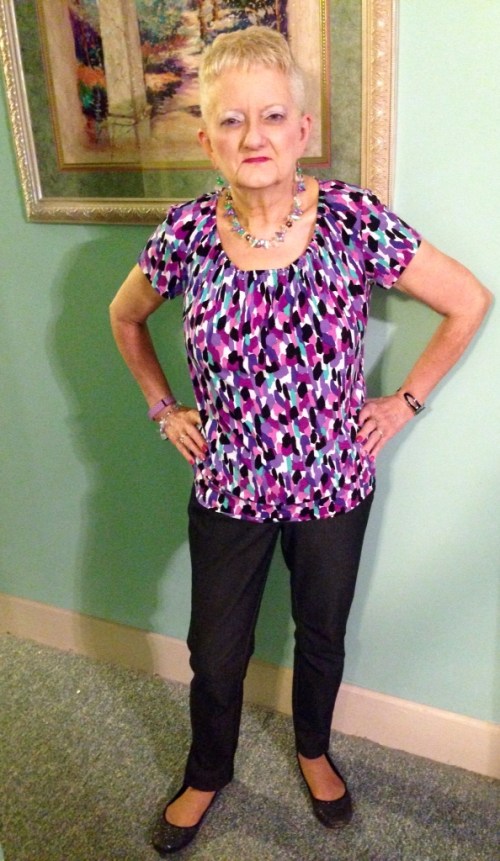 Welcome back to Carol's Corner. Another dismal day in Central New York. It was far too cold and damp. In fact I actually turned the heat back on. Well today's outfit, specifically the top has all my favorite color tones. This is in fact another of my thrift store finds from last year. Calling this ” Confetti Rain”. The funky jewelry set I bought in Hawaii when I had my dream vacation in 2010.