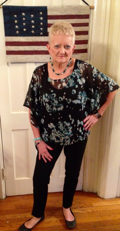 Welcome to Monday Night in Carol's Corner. Well today was a very dreary and rainy day in Central New York. Quite a few downpours. In fact in Ithaca there was a tornado warning. Hope everyone enjoyed our feature story last night. I hope to have another one soon. If you know of someone you think should be featured please contact me. Today's outfit is one I throuroughly love. In fact I dubbed it “Simply Fabulous”. This outfit speaks to me in so many ways. Of course it's the blouse that is the centerpiece. There are so MANY things I love about it, just where do I start? First it is fun and flirty. The colors are low key but beautiful at the same time. The material is light and airy, which goes well with the the design of the blouse. The print is almost like ink blots but could also be flowers. I find it very visually appealing. And then there is the fabulous movement because of the design itself. As I said, simply fabulous!