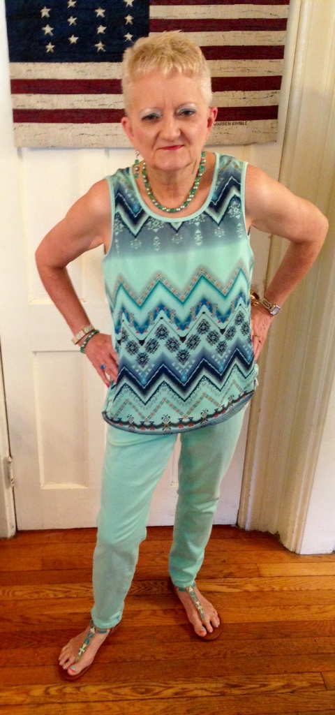 Welcome to a new day in Carol's Corner. I was so exhausted yesterday, I decided to leave Lori's story up for an extra day. So here I am ready to be back at it. Today's outfit feature's a blouse I purchased at Burlington Coat Factory yesterday on my anniversary shopping trip. The Ninth of June was my 42nd wedding anniversary and my gift was $100 to shop there. You can get so much for around that amount. I was able to buy three gorgeous dresses and four tops for $100.79. I already had all the pieces to go with the top to make a perfect outfit.
