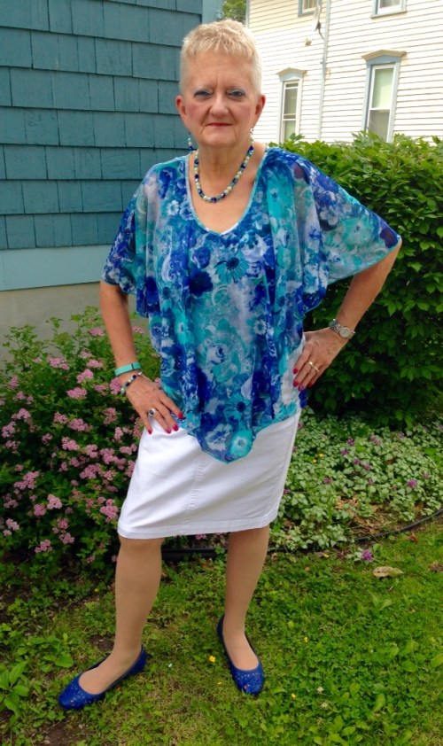 Welcome to the Friday Edition of Carol's Corner. Today turned out to be our hottest day so far. I don't know what the high ended up being, but I know it got at least as high as 88°. Just a funny side note. I could never figure out where the heck the degree sign was on my I Pad keyboard. I knew there had to be some way somewhere to get one. Finally I just googled the subject, and low and behold it was pretty simple to do,but wasn't something you could readily figure out. If anyone still doesn't know how it's done,you just hold a stylus or your finger over the zero and slide it up and there it is, mystery solved. Loving my outfit today. The skirt is my last piece in my repertoire of summer whites. The blouse is another of the pieces I purchased with my anniversary money. It is just the coolest blouse in every way, from the beautiful calming colors to the fabulous and interesting design. It's so light and airy and flowing. I call this “Summer Breeze”. My Royal Blue shoes are perfect with this. When I bought these shoes I bought them to go with a specific outfit but later found I have many things to wear them with. I love them.