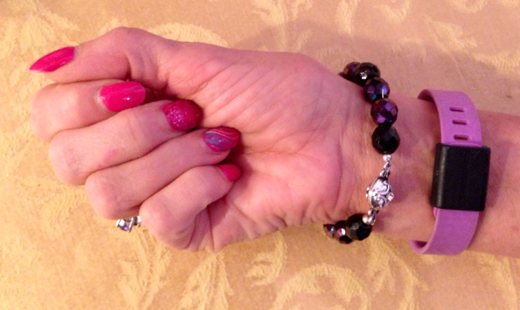 Wore a sterling and amethyst pendant and then earrings and bracelet that I made. My purple floral ring ties in well with the flowers in the blouse.