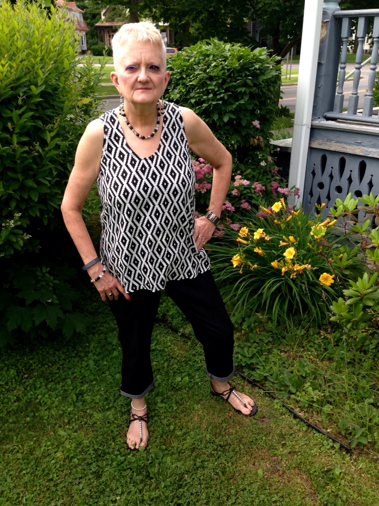 Welcome to Thursday’s edition of Carol’s Corner. Hoping you find this font easier to read. No matter what it looks like when I type it, it doesn’t look the same when it is published. It has been a rather frustrating issue for me and have yet to come up with the perfect solution. We took my picture by the side of our house again. Like the floral backdrop. Today is another of my casual looks. Just simple and comfortable. I have a number of pieces that are black and white and can be worn multiple ways in different combinations. Today’s name came to me almost immediately. Calling this, ” Diamond’s Are A Girl’s Best Friend.”
