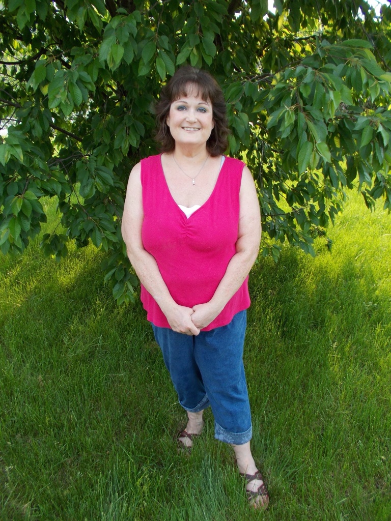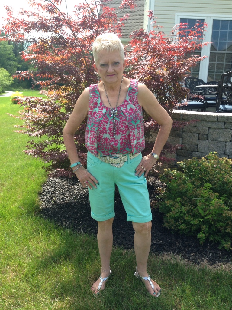 Welcome to what is going to be a very special edition of Carol's Corner. But first let's get my usual picture stuff out of the way. We're at my daughter's in Pa. and this picture was taken out back by their patio. I thought the tree made a good backdrop for this picture. Calling this ” Taking a Summer “Scroll”. Lest you wonder, the scroll as in the scrolling design on the shirt, taking the place of the word stroll.