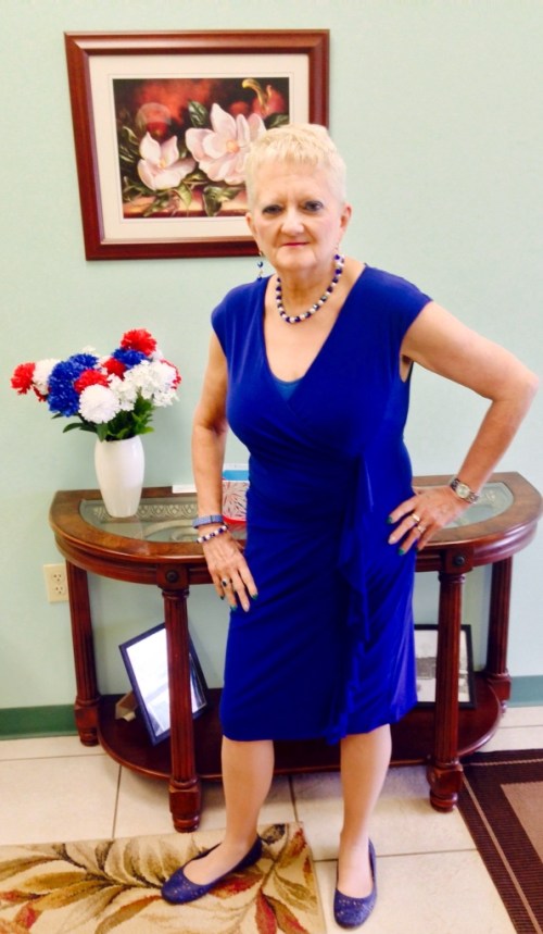 Welcome to Sunday night in Carol's Corner. Hope all our USA readers had a great Independence Day weekend. I trust that you all enjoyed the feature stories of this past week, and now we will go back to the series we were in the middle of. We took this picture where we meet for church. Thought my dress looked great next to the Red White and Blue Flowers. I totally love this dress. The color is just gorgeous and the style is amazing. Calling this one,” Blues Royalty”.