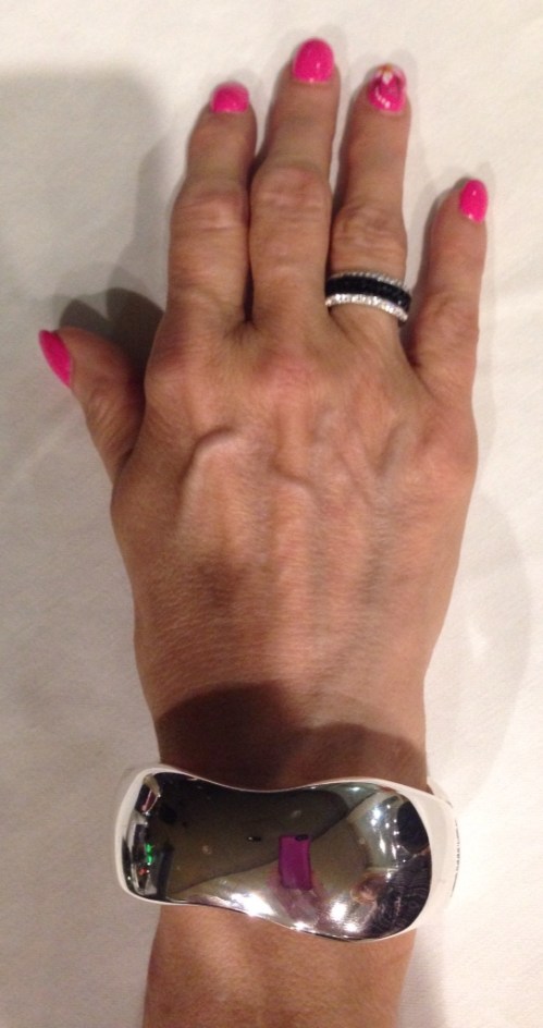 Decided to accessorize with silver to break up the black. This is my fancy silver FitBit bracelet and this awesome ring I got last year on sale as Boscov's. I even had on silver sequined shoes. Funny story, kind of. We started our evening with a block party on Main Street. It's a summer concert series with music by lots of different bands. Well every time I would clap the hinge of the bracelet opened a little and caught my arm in it and now I have about an inch wide bruise.