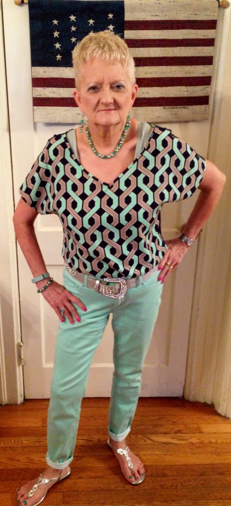 Welcome to the Tuesday edition of Carol's Corner. We had one beautiful day and now we're back to rain and more rain. And back in another flood watch for the umpteenth time. This is getting monotonous. Could we please have some summer here? Every one seems to love my outfit today. It's definitely one of my casual ones . I am so glad I bought these pants last fall along with another color. I use them quite frequently and make all kinds of different ensembles with them. I liked how I was able to bring all aspects of this together. Under the blouse is one of my Cami Shapers( a mainstay in my wardrobe). I used my blinged out silver belt and sandals to pull out the grey in my shirt. Ok, just learned something new while writing that sentence. Gray and grey are both correct spellings for the color. Gray is more widely used here in America and grey is more widely used in other countries. Always learning something. Back to my ensemble.
