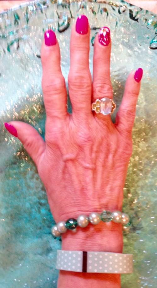 This is another set of jewelry that I made, and use it with a number of outfits. I like the combination of the pearls and the sparkle.