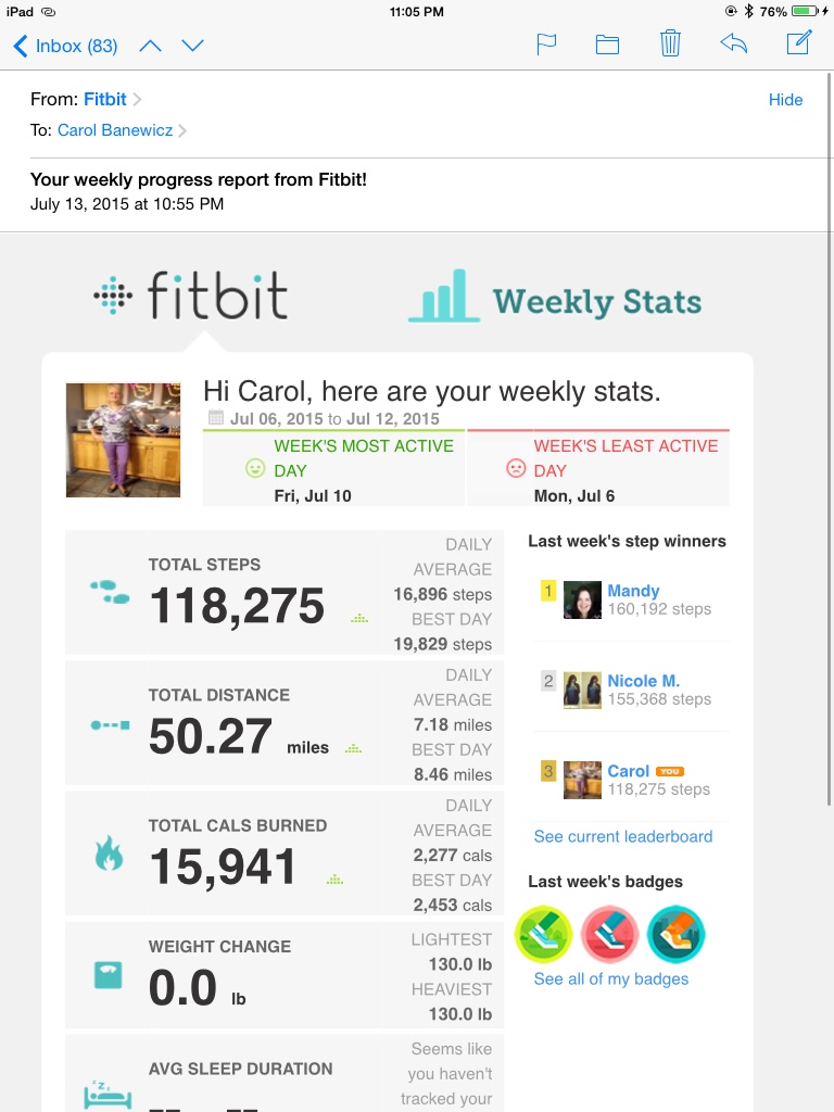 So that's the fashion end of it, now onto the meat of it's importance in my journey. I never knew just how much I would enjoy this little gadget or just how much it would inspire me. I am normally a competitive person and have been one my entire life, and I think that is a good thing in my mind. I am totally against this stupid notion that everyone should be the same. That is just nonsense. Competition encourages excellence and that is what we all should strive for. And it is not just being competitive with others but also with myself. Every day my tracker makes me aware of how active or non active I am being. It pushes me to do more, to strive for more than I might have planned on. And when I am in a challenge, I am always in it to win it. I don't always win , but a good percentage of the time I do. To me there are no downsides to using an exercise tracker. It's a way to hold yourself accountable. My daily goal is 10,000 steps but on an average day I am way beyond that and strive for as many as I can. Having my FitBit has made me up my workouts on a daily basis, except for sickness or circumstances that make it impossible to workout. On my recent vacation I packed some of my workouts and my mom's laptop. When we stayed at Ft Belvoir we had a TV and DVD player. While there I worked out every day. When we were at our friends that we visited in West Va. I used my mom's laptop. We were downstairs and one room had a table that I put the laptop on and every night I worked out. And at my daughter's in Pa. I worked out every night in their living room . I never missed one single day and always was above 10,000 steps. There is no better motivator in my mind, because you always know where you stand and what you need to do every single day, to meet your goals. If you don't own an exercise tracker already, I urge you to get one. There are many types and many brands with all kinds of price ranges. I love mine and wouldn't trade it for anything. If you want a way to motivate you to move , this is the way to do it, I guarantee it. Exercise is the key for me to keep my health issues at bay and the Fitbit keeps me motivated and accountable to myself every single day. So whatever you need to do to get moving and keep moving do it, but as for me, my FitBit and I are attached at the wrist!!! Till next time God Bless.