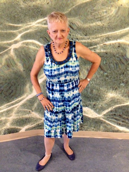 My picture today was taken at this cool wall section at a hospital that we were visiting someone in today. I thought it made a cool backdrop for this dress. Calling this,”Bejeweled Tie Dye, Summer Time Fun.”