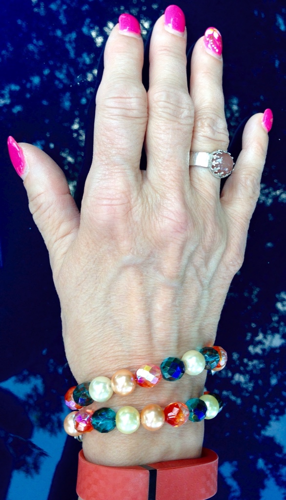 I was able to use some beautiful jewelry I had made because of the many colors in the blouse. The blouse has soft shades, the jewelry more vivid versions. I had two bracelets because I thought I lost the one. After I made another, it turned up. I kind of like wearing the two together.