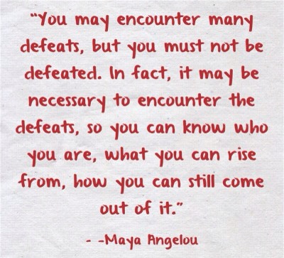 I am using the above quotation from Maya Angelou as the basis of tonight's post. Tonight's pondering and discussion is as much for me as it is for you. I am feeling somewhat defeated myself as of late. I have let my eating habits get lax and sometimes out of control. My weight is up way more than I'm comfortable with. I know exactly what to do but I have not done it consistently. I am somewhat disgusted with myself. Should I as your leader and role model be going through this? Should I already have gotten this back in control? Those are the questions that have made me feel somewhat defeated. But then I think,” Do I have to go through this to better be able to help you?” I'm guessing the answer must be yes. I have to use this as a learning tool. I have to use it to make me stronger. I have to use this temporary setback to help you overcome your own. We are in this together, so let's get through it together. We're going to have many “DEFEATS” along the way, but DON'T LET IT DEFEAT YOU. Use all your small “failures” to make you stronger for the journey that's still ahead of you.