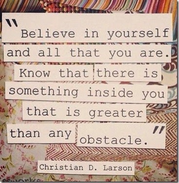 We just might be the biggest obstacle standing in the way of our own success. In order to have success in this journey we're on, we first must believe that we can succeed. We have to know in our hearts that we have everything we need no matter what life throws in our way. We have a strength somewhere inside us that just has to be tapped into and we can if we just believe it. When your next obstacle crosses your path, reach deep down inside yourself and find the strength and the belief in yourself to overcome anything that's thrown your way. You are stronger than you know. I'd like to leave you with this.