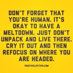 Gotta love this one. Give yourself permission to have that pity party or meltdown. But have it and then move on. Keep your eye on the prize. Remember where you're headed and refocus on the things you need to do to get there.
