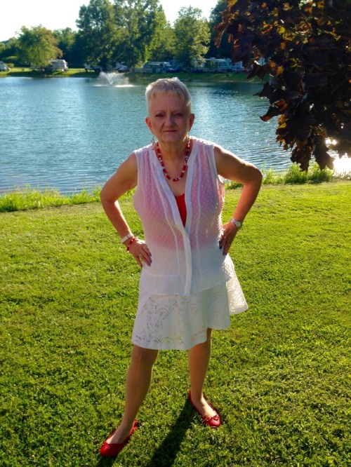 Welcome to the Saturday night edition of Carol's Corner. Had another nice day in Central New York . Nice but not hot and muggy. We still don't get very warm nights like most summers usually have though. Late night gets kind of chilly. We were dancing for our usual Saturday night at the Country Music Park and we were able to take another picture with this beautiful scenery. Today I'm at the other end of the color spectrum. I love how this outfit came together. I decided to use the white seperates pairing texture on texture. Then to add pops of color I put the bright red Cami Shaper underneath the blouse and left part of it unbuttoned. I had this gorgeous set of Jewelry I had made that was perfect with it and added my red shoes. Totally love the whole thing. Calling this one,”Snow White,Snow Red.”