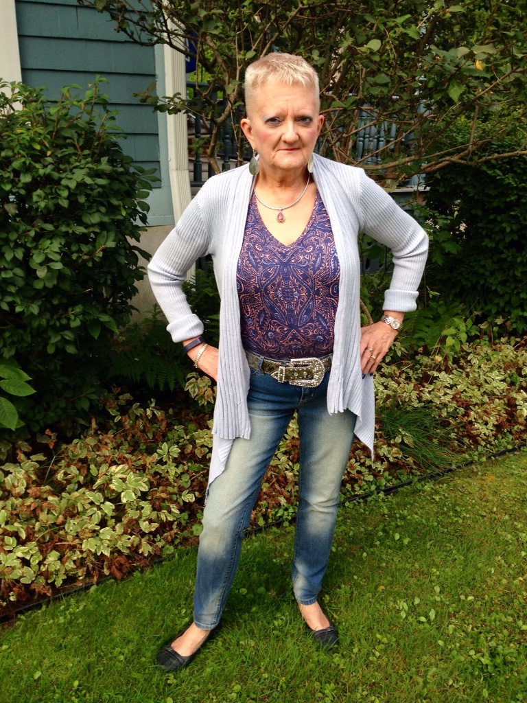 Welcome to a new edition of Carol's Corner. I have two groups of pictures today and then I have another feature story for you tonight. I have a casual outfit and then a dressy one. This first one has pink sparkly small jewels on the top sides of the jeans that can't be seen because of my sweater. They go really nicely with this shirt. I've been looking for a blue sweater for awhile and found this at a Walmart when we were away a couple of weeks ago. Calling this.”Casual Flair.”