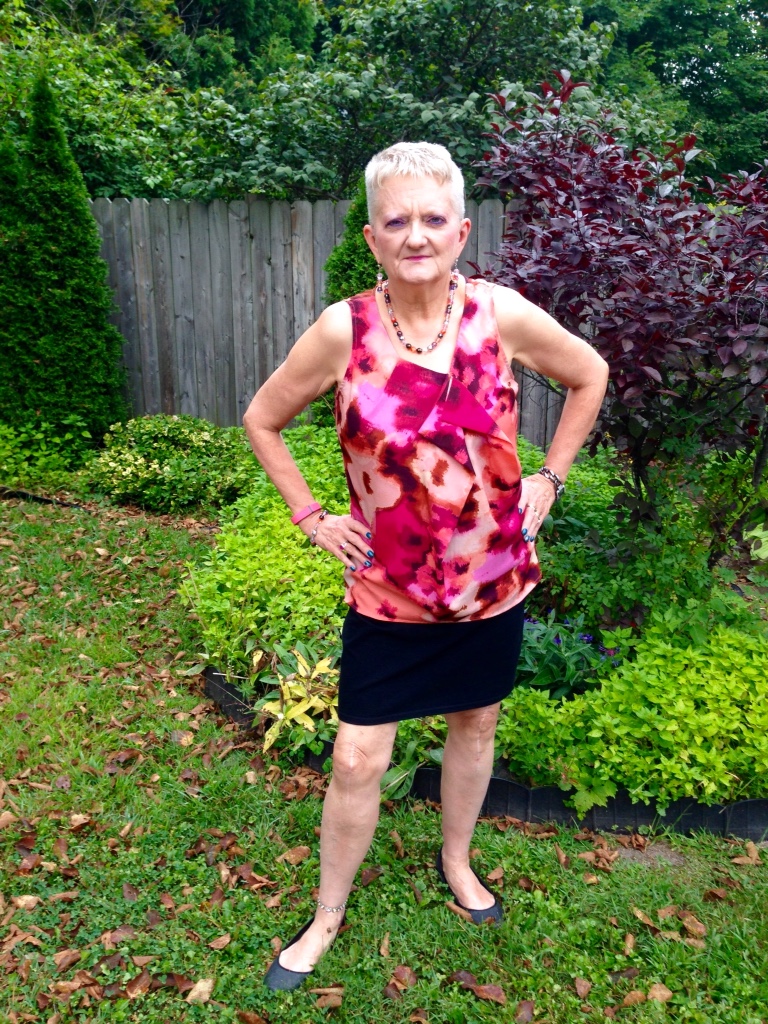 Welcome back to Carol’s Corner. Can you believe it’s already September 1st? Where the heck has this year gone? Today was the day I went to the State Fair with my girlfriend to see her Oak Ridge Boys in concert. Including today she has seen them 41 times. They know her quite well. More about that later. Loving this outfit. This blouse was a thrift store purchase from last year and I love everything about it, the colors and the interesting design of it; the asymmetrical neckline and the interesting folds in it. It’s really kind of unique. Calling this,” Passion Runs Wild.”