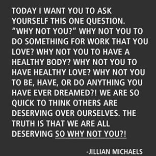 I'd like to open tonight's discussion with a question put forth by Jillian Michaels. Do you constantly think you aren't deserving of all the good things that life has to offer, do you put everyone else first and yourself last? Do you do nice things for everyone else but yourself? Don't you think it's time you changed your line of thinking? Isn't it about time that you realize your worth? You made the first step in the right direction when you started this journey, but that is just the beginning. It is time you took care of yourself, not just in diet and exercise alone, but all of you, inside and out. God meant for you to be the best you can be in every way. I'd like to challenge you to work on some areas in the coming weeks.