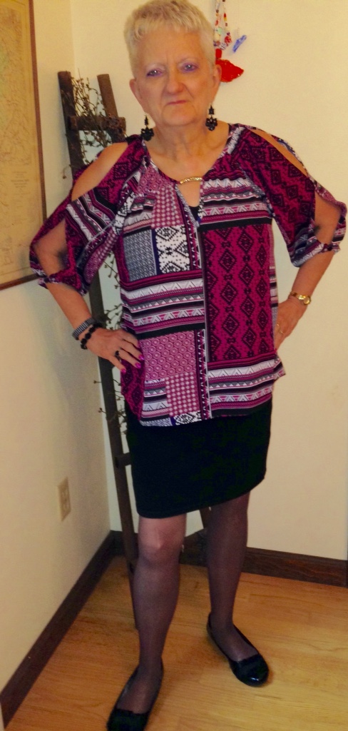 Hello out there. I'm back! Had to take a break for a few days. I was exhausted both mentally and physically. Before I get started on our discussion tonight, going to post pictures from the last two days. It's been awhile since I bought some new clothes besides exercise ones. Just got our finances back on track and no more charging. I was lucky to be at the mall in Ithaca when Bonton had a special sale. I was able to buy two tops I loved for $45. I would never have paid the full prices as each one was $46. I got 2 with the tax for $45:my kind of sale. The picture above features one of them. Love it with this skirt and dark stockings. The whole style of it is fun and interesting. Two of my young waitresses at Denny's want this. Guess that shows what I've always said; I'm young at heart. That's never going to change. So calling this ensemble, “Aztec Fury.” The waitresses named this one.