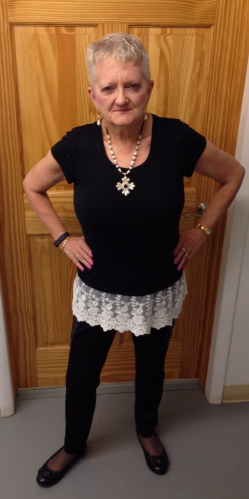 This is the other top I got in that sale. I knew it would be perfect with this pair of skinny pants. I wore this gorgeous necklace and earring set that was a gift from my daughter-in-law. It's a perfect fit for this. Everyone at dance just adored this top. Calling this, “Simplicity.” So that's my fashion for the last two days. Now on to our topics of discussion.