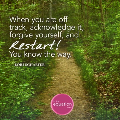 Do any of you find yourselves right here where I am and have been for about a month now? If you are, let's begin anew together. I have to, this has gone on long enough. I hate myself for slowly allowing this to happen. I should have stopped it in it's tracks long ago. But as that saying goes, “Hindsight is 20/20.” What's done is done. Nothing can change that. We can't undo it. So now what? Well I think the above pictures states it quite well. The first step is acknowledging we are off track. Then instead of beating ourself up about it (which serves no useful purpose,) we need to forgive ourself and what: RESTART that's what! How do we do that you ask? Well just as this says, “You know the way.” And I do. If I hadn't known the way I never would have gotten rid of 57 pounds in the first place. Now, I just have to get my act together and take the same steps I did before. It is just a matter of recommitting myself and just start doing.