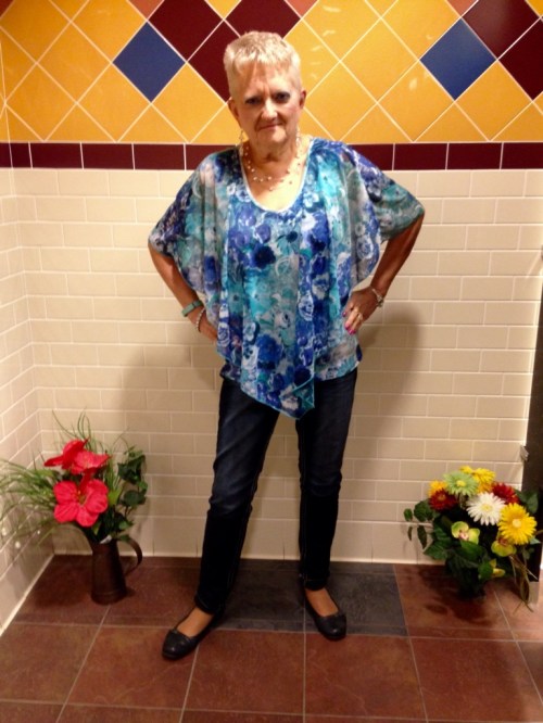 Welcome to another new day here in Carol's Corner. The weather was quite an improvement from yesterday and is getting better as the week goes on. Spent another afternoon/evening with my young server friend from Denny's. Took her to Ithaca to find her luggage set for her trip and we also hit another movie and had dinner. She was my photographer today. This is in the ladie's room at the theater. We decided the tile wall would make a good backdrop for the picture. We borrowed the flower arrangements from the sink counters and placed one on each side to add color and visual interest. I think it turned out pretty darn good. I love this blouse and wore it a number of times before. I opted for a totally different look by changing out the jewelry I usually wore to get a whole new vibe. Changing your accessories is a great way to give an ensemble a whole new look and feel. I love planning my look from head to toe. Fashion is a wonderful playground; have fun with it. You will be surprised by the difference it can make in both how you look and how you feel. Even if you are going through a rough patch in your journey (and I am,) these things can make you feel like a million bucks. And believe me people notice. Calling this one, “Walking Garden.”