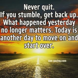 We all stumble. We all go through rough patches. It's the nature of the beast. It is what we do, when we do, that defines us. Do we pack it in and say I Quit, or do we dust ourselves off and keep on going? What happened yesterday or last week doesn't matter. Forget yesterday. Every day is a new opportunity to get things right. And if you don't get it right today there is still tomorrow. The only time that you can be defeated is when you decide to quit. Don't be that person. Resolve to start over and keep on going.