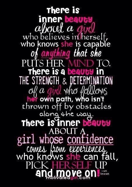 You can become this girl. You can have the inner beauty that is enunciated in the graphic above. Wake up every day and believe. Start putting those beliefs into actions. Show the world around you a new confident strong woman,one they haven't seen before. Sure this journey may be long, it may be hard; it most probably will be. There will be good days and bad days, but you have the strength and determination you need when you JUST believe in yourself. Start showing the world the new confident you. Work hard every day. Do all the things you need to do with your food plan and your exercise program, but while you're doing that, learn to love yourself wherever you're at.