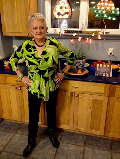 Welcome to a new edition of Carol's Corner. Sorry for not being able to put together a new post last night. Had a case of exhaustion and just couldn't do it. So here I am back at it, hoping to inspire and motivate someone who needs it. Everyone seems to be enjoying taking part in naming my ensembles. The winner for this one is Wendy Lawrence with, “It's Hallow-green time.” I thought that was quite clever and paired well with the background of my decorated kitchen. I finally got everything cleaned and decorated for the fall season. After Halloween I will be transitioning to Thanksgiving and then Christmas. Now that one is a multiple day undertaking. Decorating is another of my special talents that the Lord gifted me with and that I love doing. It always makes me feel happy when I complete a decorating season and just sit back and enjoy it