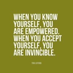 Think about what this says. It is a very powerful statement. Do you know yourself and what you are capable of? Do you accept yourself? If your answer is no, you need to set out to discover who you really are and when you do, you need to accept who you are . Now you are ready to begin to conquer all the things that are keeping you from realizing your dreams. You can and will be successful once you truly believe in yourself. When you do, nothing and no one can stop you. Remember, it's all there right inside you, ready and waiting. Unleash the power and begin to change your life.