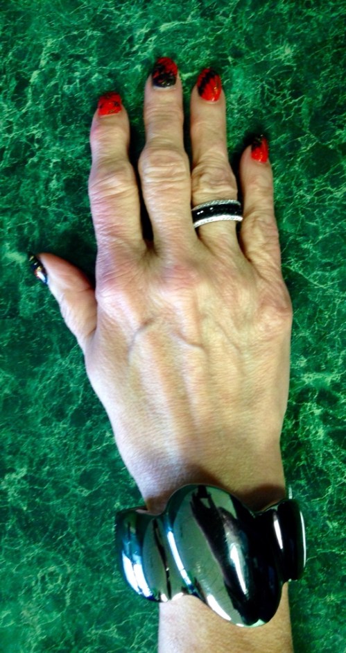 Went with all black accessories. I totally love my fancy black bracelet that houses my exercise tracker. It's so rich and elegant looking. And this pretty cocktail ring I got last year at Boscov's is another perfect complement to the ensemble.