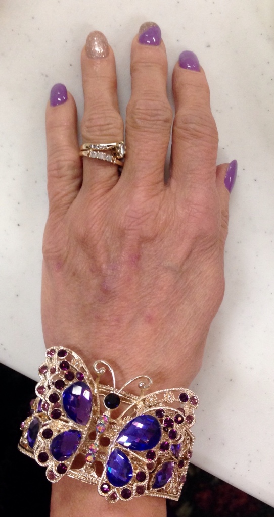 My nail's were done especially to go with my costume. For some reason the ensemble looks more blue in the picture but it is actually a very vivid deep purple. I had to forgo wearing a watch. On the right wrist I wore this beautiful bracelet that houses my FitBit exercise tracker. I chose this purple ring which is a beautiful flower.