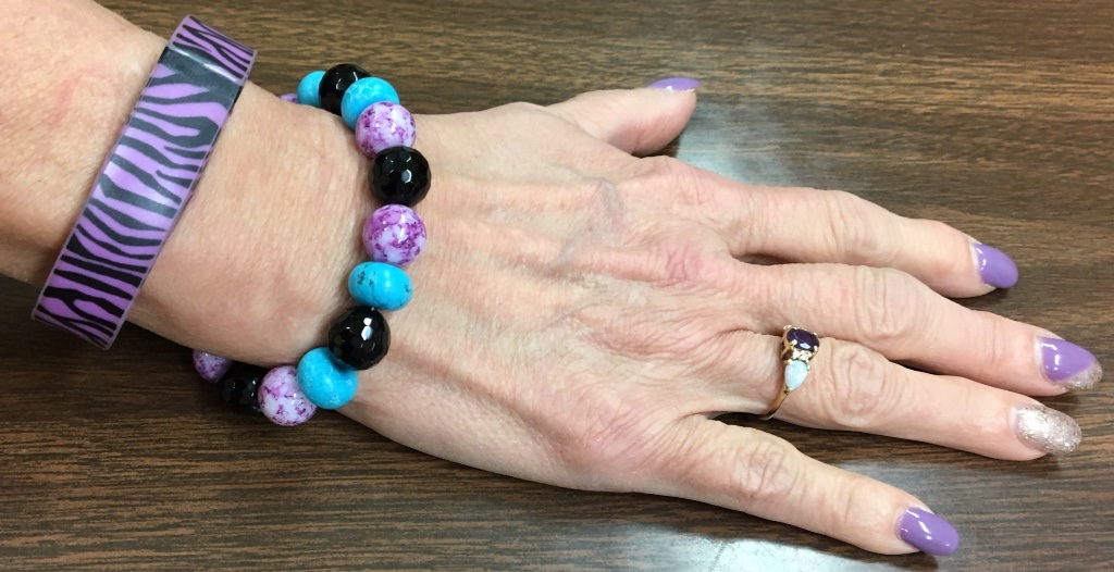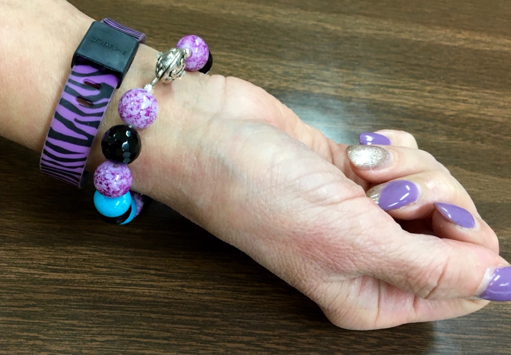 The jewelry I chose for this is a set I made quite some time ago and contains all real gemstones. The colors blend perfectly with the top. I decided on the Zebra striped FitBand to wear with this ensemble.