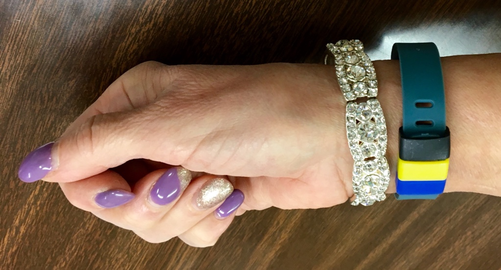 I also decided to glam this outfit up a bit with my jewelry accessories as in the bracelet, the long necklace and the earrings. I chose a blue toned FitBit Band that blends with the blues in the top.