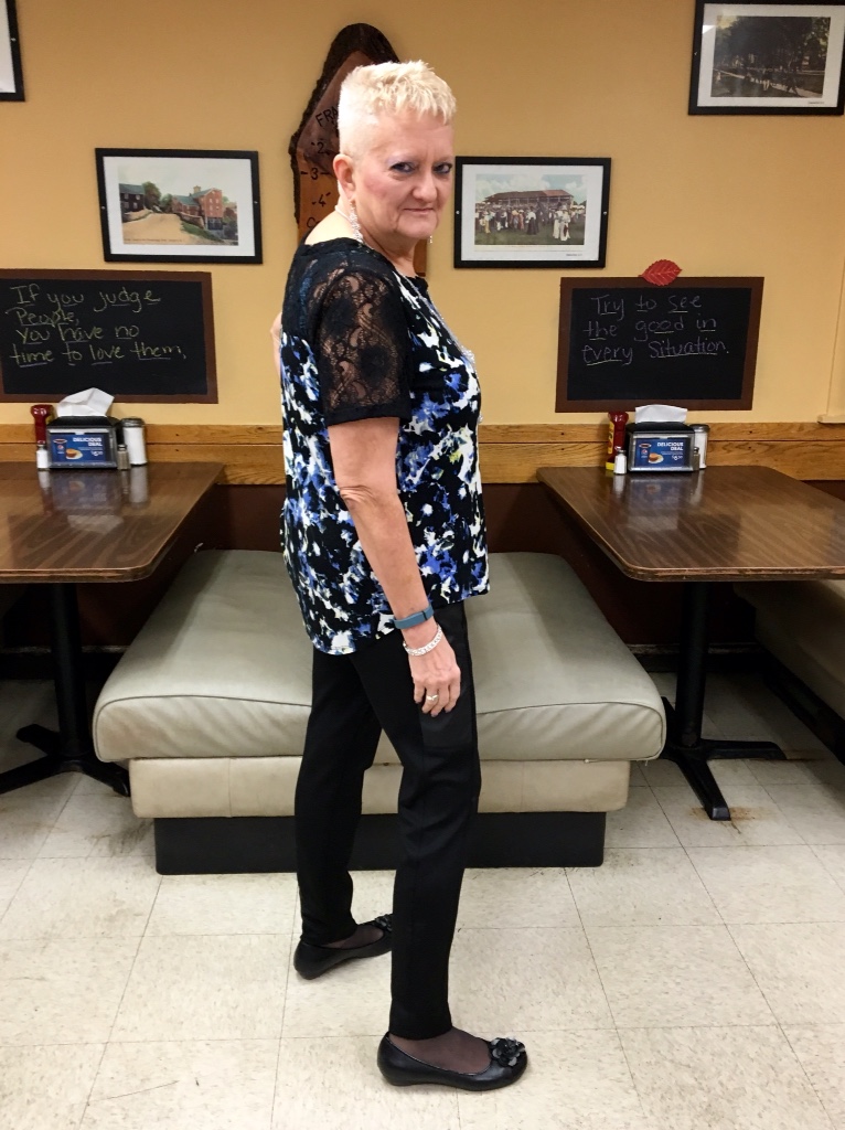 Welcome back to Carol's Corner. Sorry I had to take a little break. All rested up today. Pick up my hubby at the airport Tuesday evening, so then he can resume his photographer's duties. This picture was at the local diner again. I'm going to show you a sideway's view because the yoke in back makes this an interesting top.