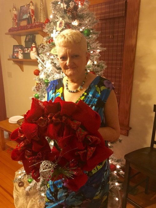 This last picture was taken later the same evening at my hairdresser's house where she had a burlap wreath making party. This was my creation with a lot of help from her. We're going to do the netting wreathes for Valentine's Day. Should be fun.