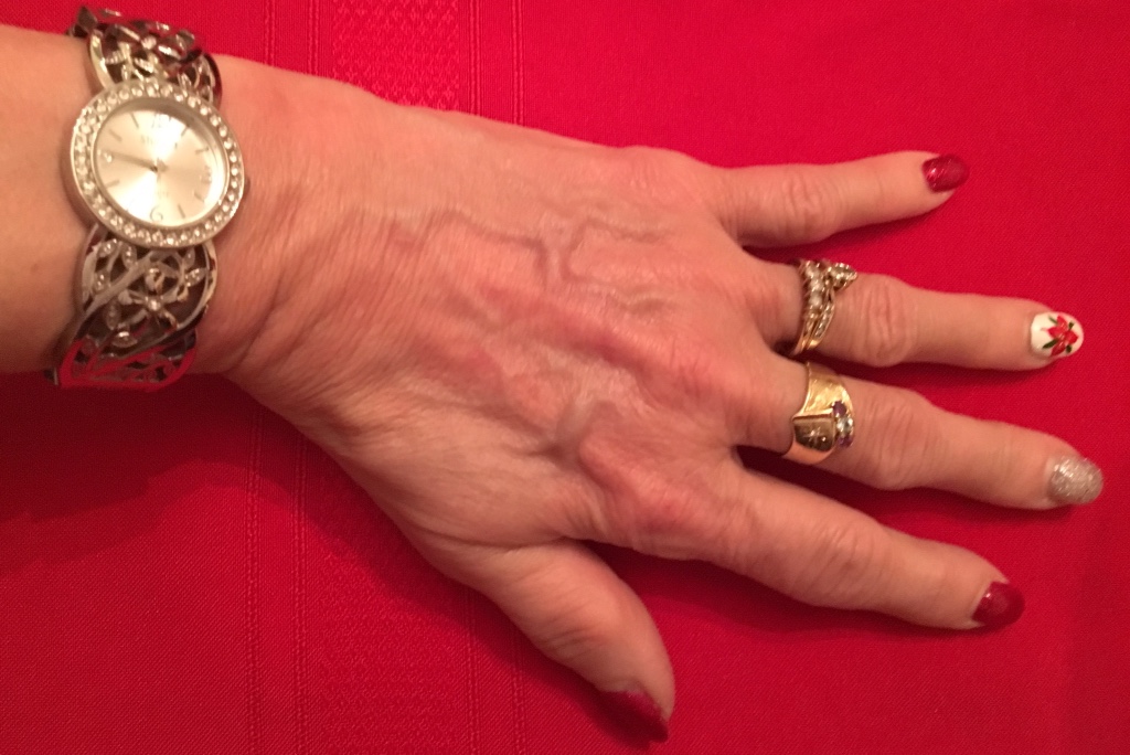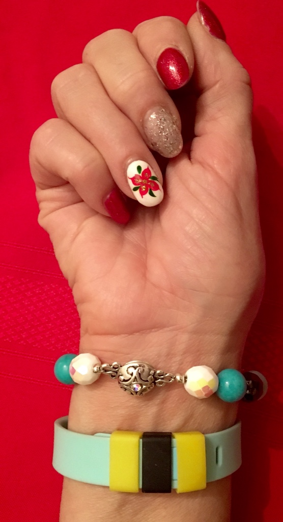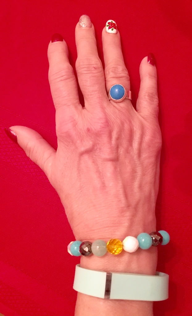 The jewelry I wore for this is a set I made specifically to go with this top. It pulls in most of the color's in the blouse. For some reason the color of my FitBit band did not come out properly. It is a light Aqua. It looks almost white in this picture. Also you'll see another of my custom designed rings that a jewelry artisan made me. I love all of them.