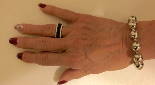 Except for my gorgeous ring I decided to go silver-toned with all my jewelry. It goes quite well with the bling in the blouse which I really like a lot.